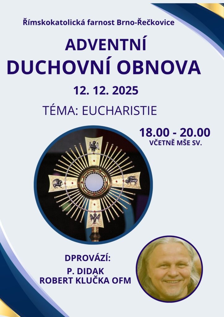 Pozvání přijal františkán o. Didak, který se bude spolu s námi zamýšlet nad tématem Eucharistie. Začínáme mší svatou, kde bude tématicky zaměřeno kázání a po mši svaté nás čeká přednáška a krátká adorace.