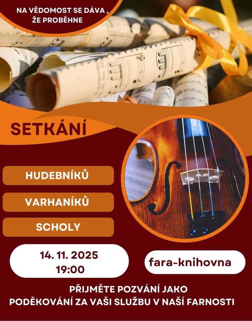 Zveme všechny členy scholy, hudebníky a varhaníky na společné setkání do farní knihovny dne 14. 11. od 19 hodin.